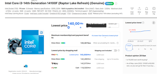 其中,第12代的i5-12400F价格涨幅达到了11%,从159140韩元上涨至177290韩元;第13代i3-13400F处理器在不到三周内价格上涨了约14%;而第14代的i3-14100F处理器价格更是上涨了15%,从121990韩元涨至140000韩元。