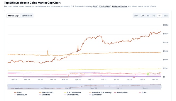 据 CoinGecko 数据显示,今年欧元挂钩稳定币的市值已翻倍,Circle 发行的 EURC 占据市场主导地位,市值攀升至约 2.7 亿美元。