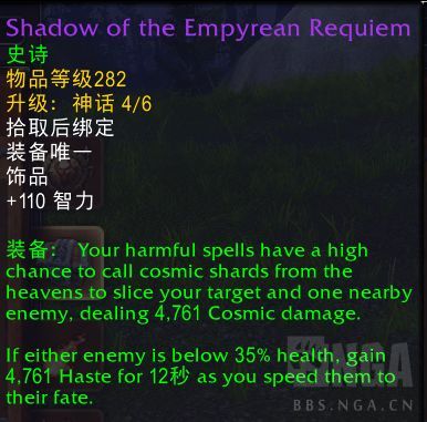 装备:你的伤害型法术有高几率从天界召唤宇宙碎片,切割你的目标及附近一名敌人,造成4,761点宇宙伤害。