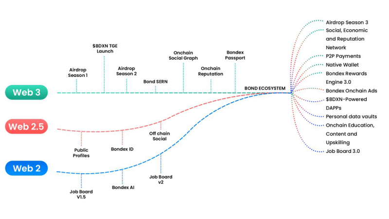 Bondex是一个新的、游戏化的专业网络,奖励用户治理权和收入分享。这是一个分布式商业模型,用户通过其本币BNDX的收入共享成为部分网络所有者。Bondex的路线图描述了其从当前的Web2.5基础架构逐步过渡到完全去中心化Web3平台的过程。该平台正在分阶段推出新功能和工具,支持长期增长,每个新阶段都基于上一个阶段的成果。这种方法将打造一个无缝连接Web2和Web3用户的生态系统。