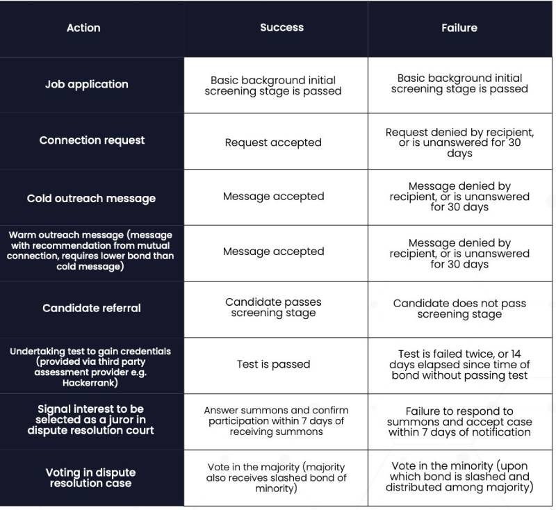 Bond Points(BP)可以通过自然获得或在应用内购买。用户需要将BP用于执行各种操作,例如将代币质押作为抵押物进行操作,操作成功后会立即退还质押的BP。如果操作失败或执行不当,绑定的BP将丧失。BP代币作为Bondex生态系统内的实用工具,允许用户解锁特殊功能,提升个人档案的可见度,并获得更多价值创造活动的激励。用户可以通过多种方式获得BP,包括完善个人资料、申请职位和推荐候选人。以下表格展示了需要绑定的操作,以及“成功”和“失败”的标准: