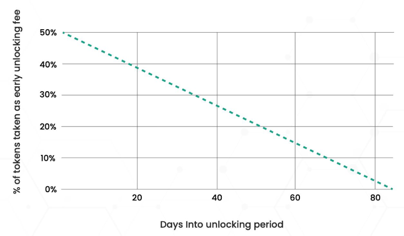 如果用户在解锁期的第一天就领取代币,那么提前解锁的费用将是最初锁定代币的一半(50%)。如果用户在解锁期的第38天领取代币,那么提前解锁的费用将计算为最初锁定代币的27.71%。