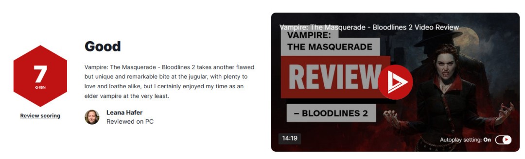 《吸血鬼:避世血族2》媒体评分出炉,该作获得IGN 7分评价,Metacritic收录21家媒体评分,PC版综合均分64分。
