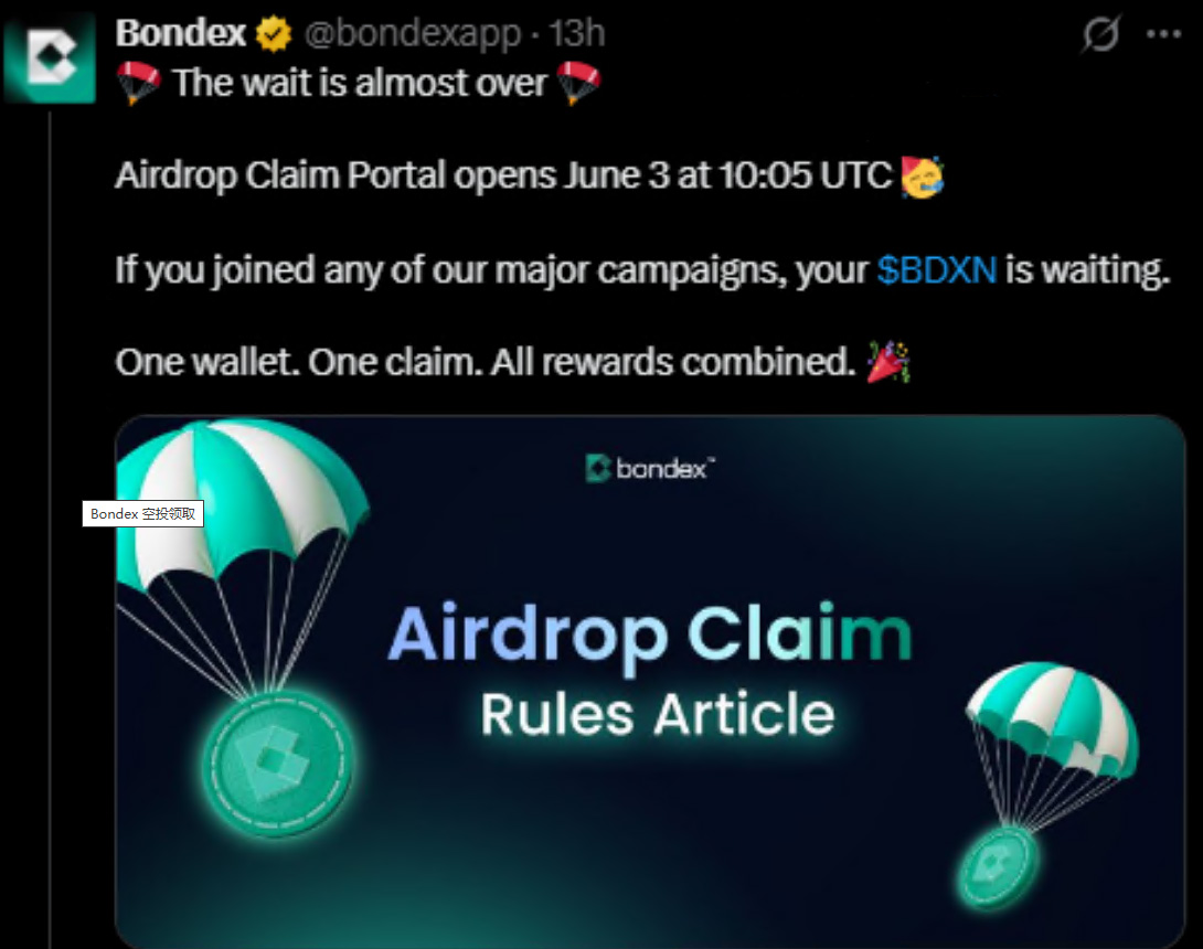 Bondex 终于将于今天(2025 年 6 月 3 日)上线。期待已久的 BDXN 代币开始在几家顶级交易所交易,空投领取门户也将同时上线。