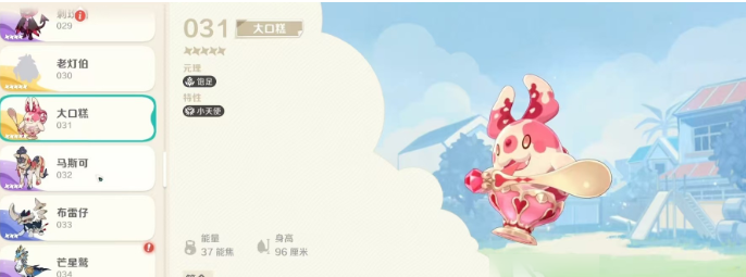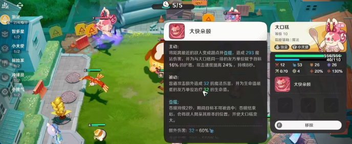 大口糕属于后排辅助型魔法输出精灵,其元理为“饱足”,特性是“小天使”,技能名为“大快朵颐”。该技能分为主动和被动两种效果。主动释放时,大口糕会选择距离最近的敌人,将其变为糕点并吞噬,造成魔法伤害。同时,与大口糕同一排的友方单位将获得一个护盾和额外的攻速加成,持续8秒。具体数值上,护盾量为目标最大生命值的16%,攻速提升幅度为24%。