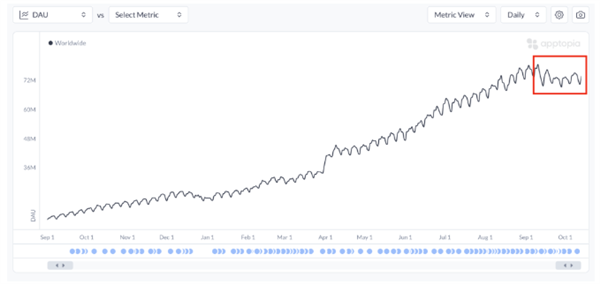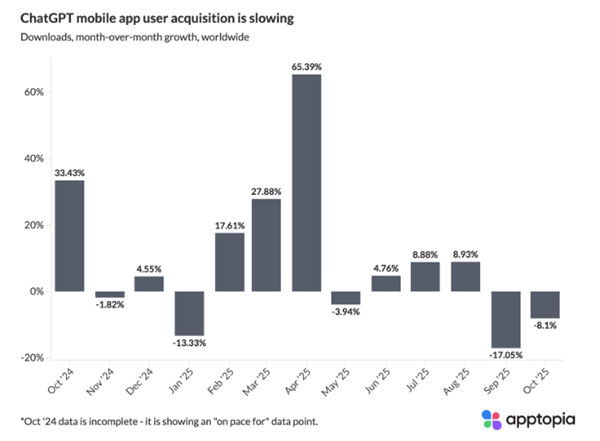 Apptopia表示,虽然10月才刚刚过半,按照下载量的环比百分比变化趋势,本月的环比降幅预计将达到8.1%。