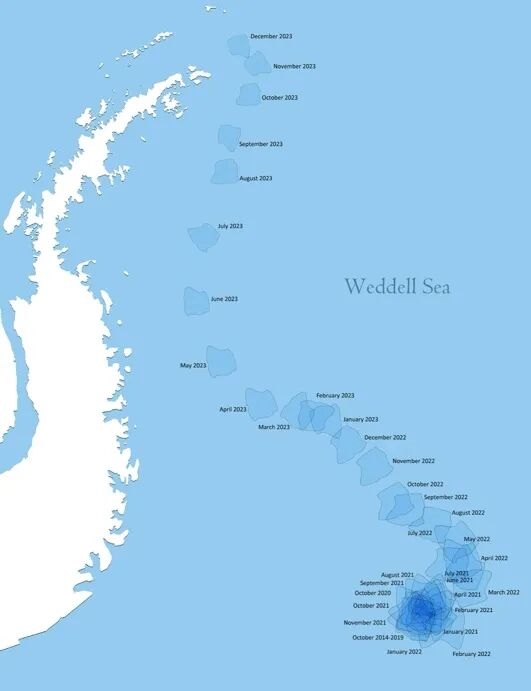 此后, A23 经历过一次破裂,而A23a 则是其破裂后、飘在海上的一块大冰山。历史上曾经出现过比 A23a 更大的冰山,比如面积超过 1 万平方公里的 B15,以及面积超过 5000 平方公里的 A68a ,但目前依然在海上飘着的冰山中,A23a 是最大的。