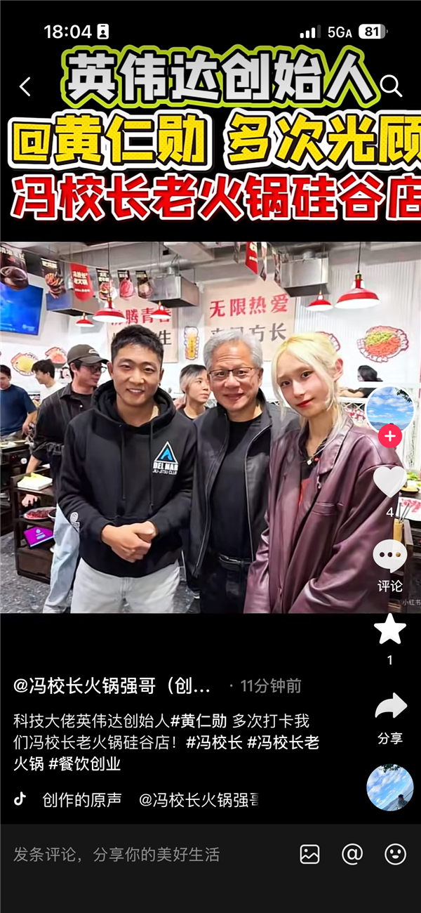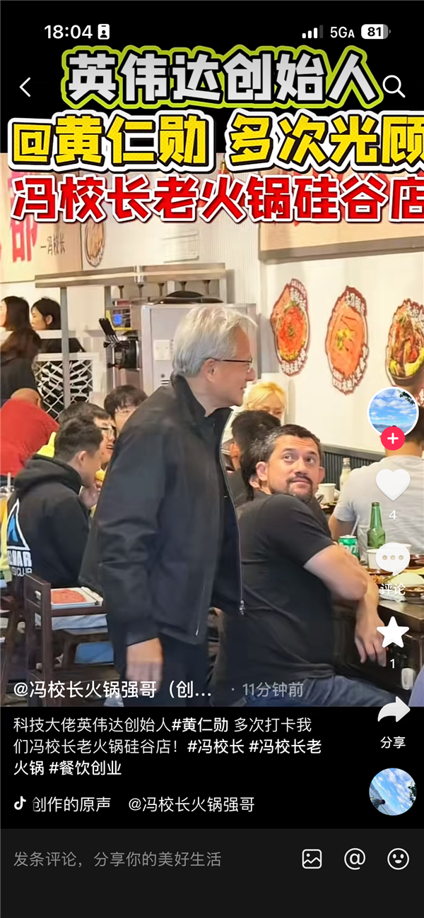 该账号配文透露,黄仁勋已多次光顾这家位于硅谷的冯校长老火锅店。