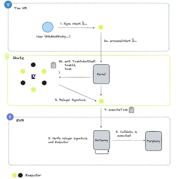 用户与其原生链(TON、Solana、EVM……)进行交互,只需签署一个“意图”,Skate 就会处理该意图并将其发送到目标链以完成操作。得益于此: