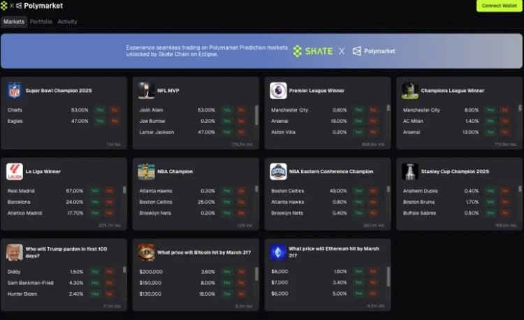 转移钱包使用桥梁资产转移用户只需从 Solana/Ton 钱包登录,签署购买“意向”,Skate 将在后端执行与 Polymarket 的所有交互。因此,用户可以: