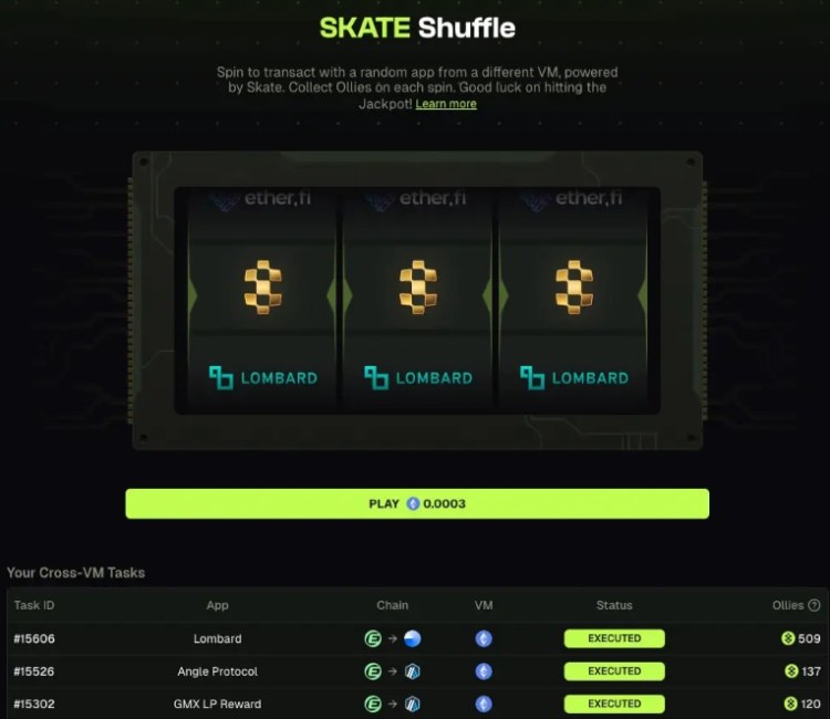 Skate Shuffle 是一种“旋转并赚钱”的体验,SolanaVM 用户可以旋转并与多个 EVM 应用程序交互,例如: