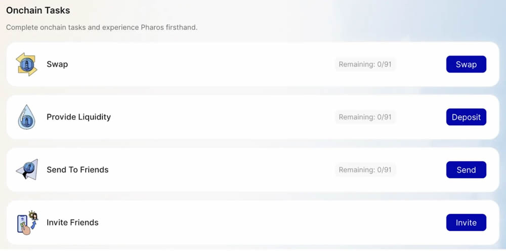拥有代币后,即可参与链上任务。首先在平台上使用测试代币对进行兑换。向池子注入流动性以赚取流动性提供者份额,并向其他用户发送代币以完成其他任务。新的链上活动可能会随着时间的推移而添加,因此请定期查看平台以获取更新。