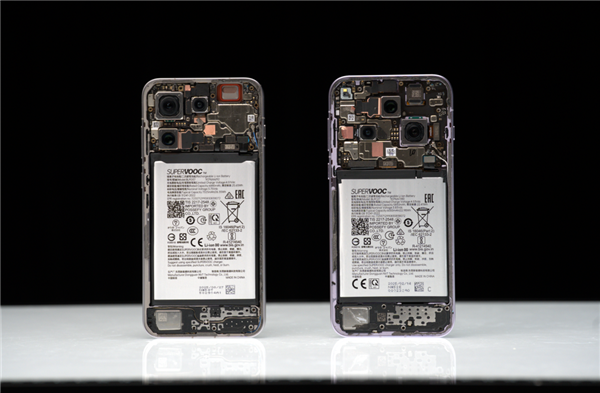 于是我们直接拆了一台 Find X9 ,跟使用上一代模具的 Find X8s+ 做了一个对比。拆开后盖,看到内部结构后,你就会发现, Find X9 把大部分空间都留出来给这块大电池了。