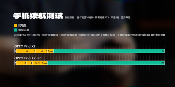 我们也分别给两台手机做了续航测试,三小时测下来 Find X9 Pro 剩余电量 78%, Find X9 剩余电量 74% ,在我们测过同尺寸的机型里算是顶顶好的表现了。
