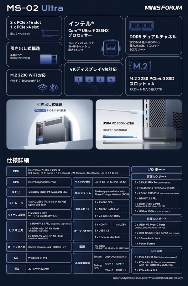 它还有四条DDR5 SO-DIMM ECC内存插槽(最大容量256GB),四个M.2 2280 PCIe 4.0 x4 SSD接口(单个最大4TB),