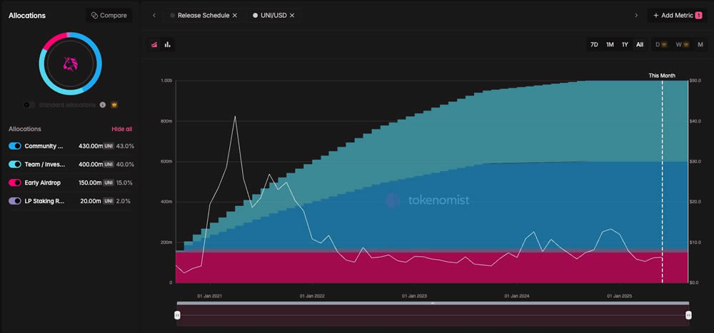 UNI代币本身已完全解锁,供应量约为 10 亿。根据 Tokenomist 的数据,UNI 的“总解锁进度”为 100%,这意味着没有剩余的大额解锁。因此,UNI 不会出现与解锁相关的通胀来对价格造成压力。该代币的市值约为 39-40 亿美元(价格约为 64-68 亿美元)。