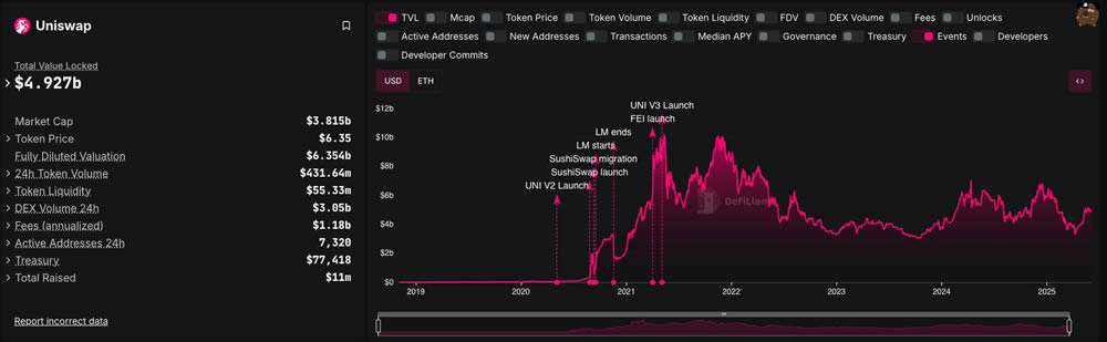 Uniswap 的总锁定价值约为 49.2 亿美元,分布在多条链上。该总锁定价值较 2021 年的峰值(当时曾短暂达到约 100-120 亿美元)有所下降,但仍保持健康水平。