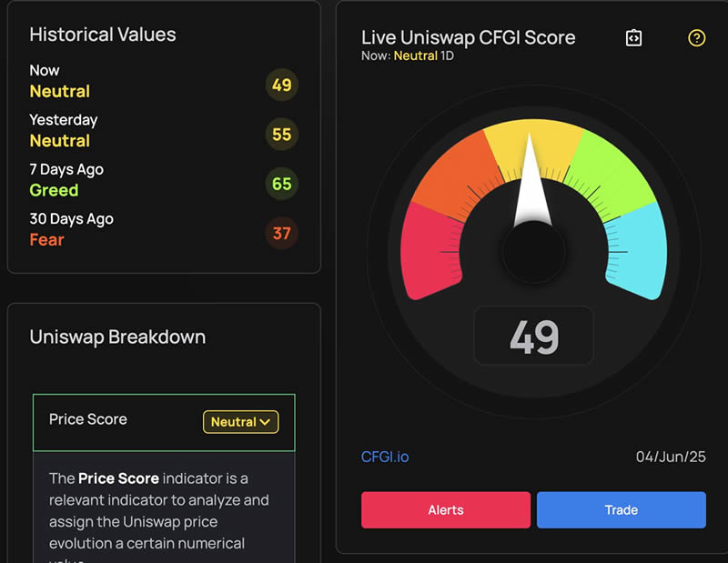 这一波动表明,社区乐观情绪在五月低迷之后有所回升。在 X 和 Telegram 上,关于 UNI 的讨论正因利好消息而升温。市场热议具有自我强化的作用;近期 UNI 的大幅上涨使其价格从 5.65 美元(5 月初的低点)上涨至 6.94 美元左右(6 月 4 日的高点),这自然提升了市场关注度。