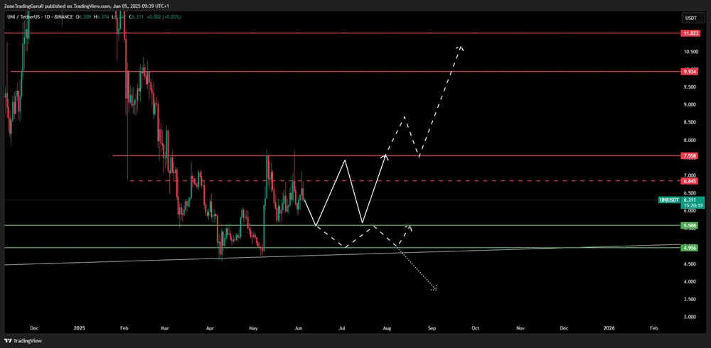 每日(D1)收盘价高于 7.558 美元将是关键的技术确认,表明 UNI 已从修正阶段过渡到新的看涨冲动。