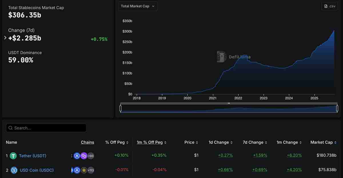截至目前,全球稳定币市场仍由美元计价产品主导。根据DefiLlama的数据,Tether的USDT与Circle的USDC合计占据超过83%的市场份额,在总市值达3063.5亿美元的稳定币生态中占据绝对领先地位。