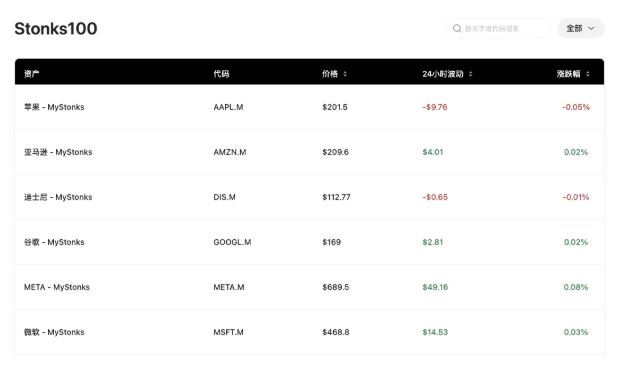 MyStonks是在Meme币 Stonks社区CTO基础上创建的去中心化加密资产交易平台,用户也可在该平台Stonks100板块购买美股,其中包含AAPL、AMZN、DIS、GOOGL、META、MSFT、NFLX、NVDA等95 支美股及5只在美国上市的加密和股票ETF。