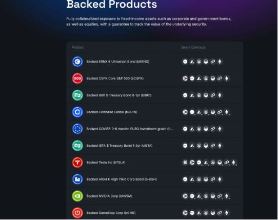 Backed是一家瑞士的资产代币化发行商,主要致力于将股票和ETF代币化。Backed已经在多链上推出了bCOIN、bCSPX、bTSLA、bNVDA、bMSTR等10种美股代币,但Backed本身没有推出美股代币交易平台,用户可以直接通过链上DEX,如CoW swap、1inch等交易其推出的美股代币。