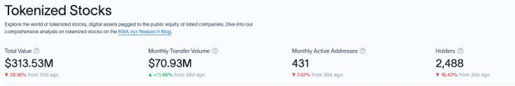 美股代币化确实具备打破地域与 KYC 限制、支持 7×24 小时全天候交易、让非美国用户低成本持有美国资产、避免高额跨境手续费等多重优势。然而,尽管机构曾预言美股代币化将带来万亿美元级的 RWA 市场,根据RWA.xyz数据,如今整个 RWA 规模也仅约 230 亿美元,其中代币化股票不过占 3.13 亿美元,市场规模远未达到想象中的高度。