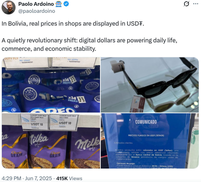 在6月7日的X帖子中,Paolo分享了玻利维亚商品以泰达币(USDT)定价的图片,包括太阳镜和糖果。其中一张照片还显示了一则告示,提醒顾客价格是以USDT设定的:
