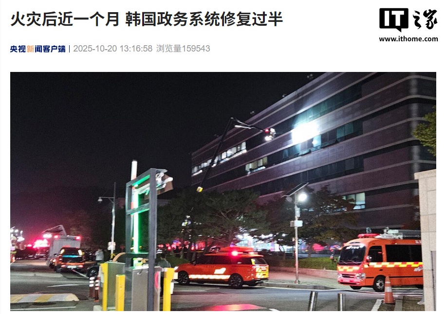 10 月 20 日消息,据央视新闻报道,韩国政府 10 月 20 日称,因上月底国家信息资源管理院起火而瘫痪的政务系统至今修复过半,