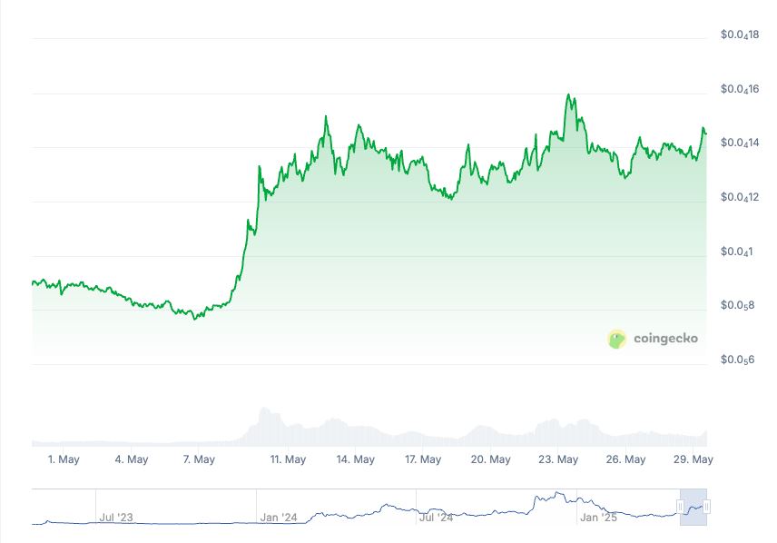 PEPE 的价格迅速做出反应,第二天从约 0.00000185 美元跃升至 0.00000241 美元(+30%),不久后又进一步攀升至 0.00000255 美元(+38%)。这一强劲反弹使 Pepe Coin 在 2025 年 5 月下半月重新成为 meme 币市场的焦点。