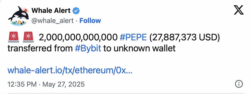 2025年5月27日,一笔涉及2万亿PEPE代币(价值约2790万美元)的巨额交易被检测到,该交易从Bybit交易所转移到一个身份不明的钱包。此次转移恰逢价格波动加剧的时期,引发了人们对鲸鱼正在积极囤积该代币的猜测。
