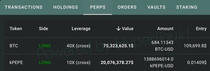 同时,他还持有价值 7500 万美元的 BTC 多头仓位,杠杆率为 40 倍,表明他对模因币和主要加密资产即将到来的看涨浪潮充满信心。