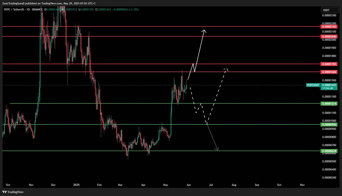 如果市场情绪保持看涨,且买家继续守住关键支撑位,PEPE 可能会再次突破。当前阻力位在 0.000014 美元至 0.000015 美元之间。成功突破该水平可能为下一个目标区域0.000018 美元至 0.000020 美元铺平道路,该区域接近 PEPE 2025 年迄今的最高点。