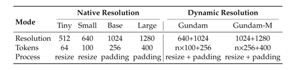 此外值得一提的是,为了灵活应对不同的压缩比需求和实际应用场景,DeepEncoder被训练成支持从“Tiny”(512x512, 64token)到“Gundam”(动态分块,近800token)等多种输入模式。