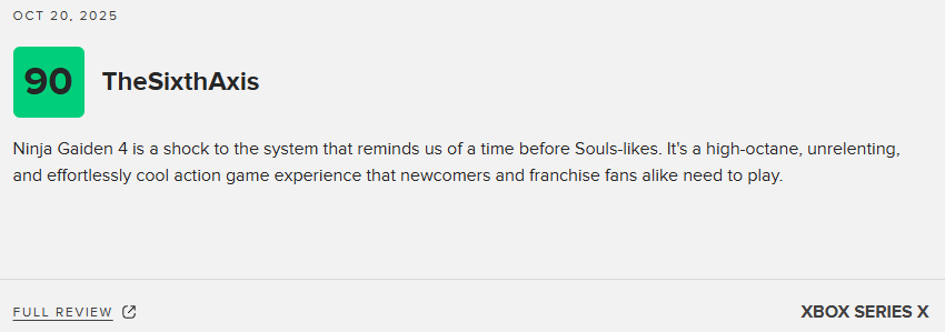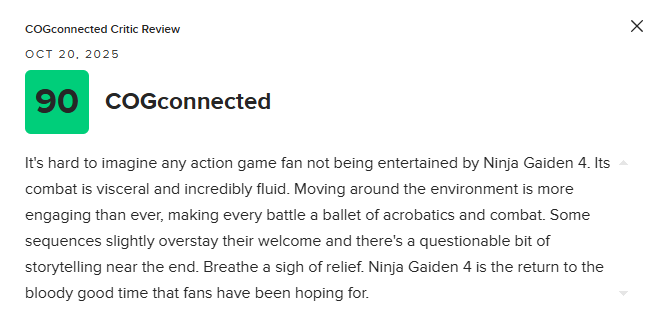 由Xbox Game Studios发行,白金工作室和Team NINJA联合制作的动作冒险游戏《忍者龙剑传4》现已正式发售。该作的媒体评分也已解禁,目前Xbox版M站均分为83分,共收录38家媒体。