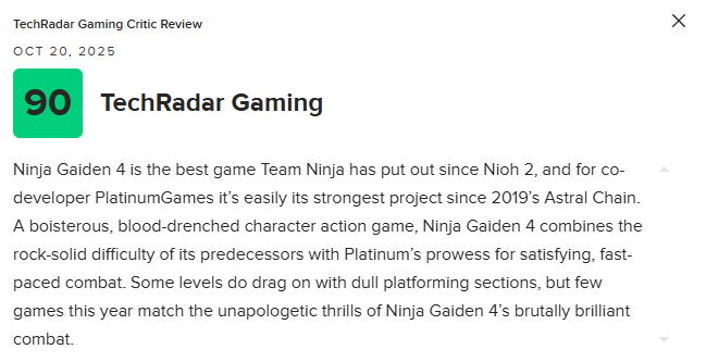 《忍者龙剑传4》是Team Ninja自《仁王2》以来推出的最佳作品,而对于协力开发的白金工作室来说,这无疑也是自2019年《异界锁链》以来最强劲的一作。