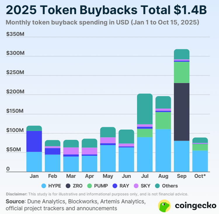 截至目前,2025 年的代币回购总额已超过 14 亿美元,由于 Hyperliquid 的援助基金在低流通量 / 高 FDV 代币经济学饱受批评的情况下推广了该机制,因此成为一个热门话题。换言之,今年各项目平均每月在代币回购上的支出总计 1.4593 亿美元。