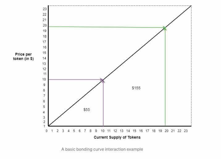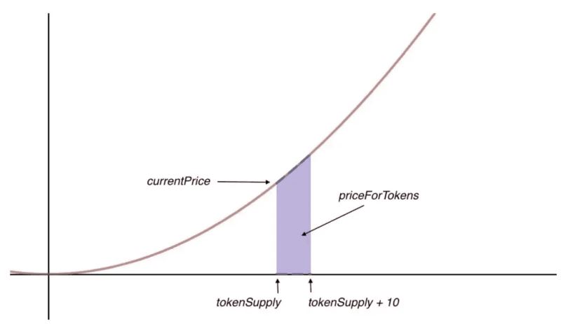 提升估值:由于联合曲线内置于区块链,因此透明透明;由于其基于数学构建,因此可预测且准确。联合曲线也是一种动态计算加密货币价值的方法,因为它将生态系统的增长考虑在内。联合曲线认识到,随着生态系统的增长,该生态系统的代币数量也会增长,其价值也会随之增长。预设代币价值的涨跌方式:联合曲线表明代币和货币的价格将随其供应量的变化而变化,要么下降,要么上升,从而创建一个连续的代币模型。如果开发者想要更好地控制这方面,他们可以选择特定的联合曲线形状,这将决定代币价值根据供应量增加多少。无需交易所:作为全自动做市商 (AMM),联合曲线不仅可以计算代币价格,还能实现交易。数学算法会估算代币的成本,并将其显示给投资者。之后,投资者可以直接在交易所买卖代币。这项功能非常令人兴奋,因为它使加密货币进一步摆脱中心化。允许在一个生态系统中使用多种代币:联合曲线的另一个功能是,通过铸造自己的代币,它可以允许在一个生态系统中使用多种代币。开发者可以在生态系统中构建多个联合曲线,从而根据开发者所需的功能,将不同的代币用于不同的项目。这提高了灵活性,因为不同的代币可以在不同的区块链上使用,具体取决于代币的用途以及连接区块链的智能合约或双向挂钩。简单的线性联合曲线表示x = y,也就是说,代币供应= 代币价值。这意味着代币 10 的价格为 10 美元,代币 20 的价格为 20 美元。然而,这并不意味着如果一个人购买 10 个代币,他们将支付 10 美元。代币 1 的价格为 1 美元,代币 2 的价格为 2 美元,代币 3 的价格为 3 美元,依此类推。因此,如果一个人想购买 10 个代币,他们将必须支付这 10 个代币中每一个的价格,即 1 美元 + 2 美元 + 3 美元 + 4 美元 + 5 美元……,总成本为 55 美元。如果一个人想买 10 个币,但已经购买了 10 个,那么该个人将从代币 11 购买到代币 20。这意味着他们将支付 11 美元 + 12 美元 + 13 美元 + 14 美元……,总计 155 美元。因此,这种线性联合曲线为早期投资者带来更高的利润。