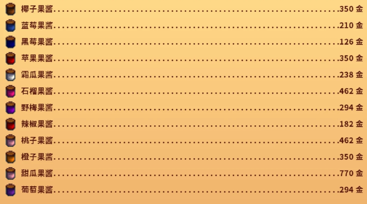 至于杏子、蓝莓这类也可放入罐头瓶中,它们做出的成品售价和小桶一样都是一百五十币。但用瓶子做果酱的速度,要稍稍快于小桶酿出的果酒。