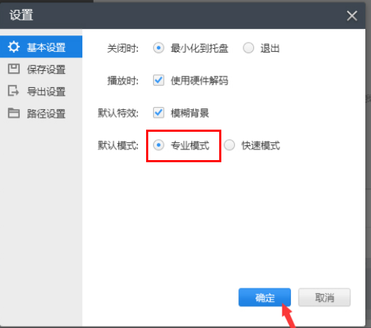 3、然后找到右侧中的"默认模式"一栏,将其中的"专业模式"勾选上,最后点击"确定"保存即可。