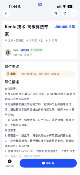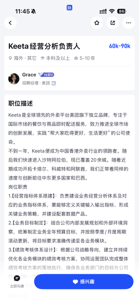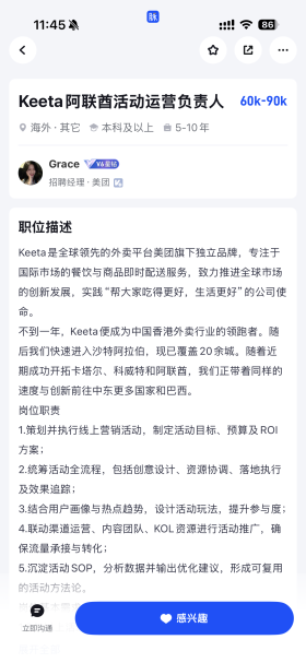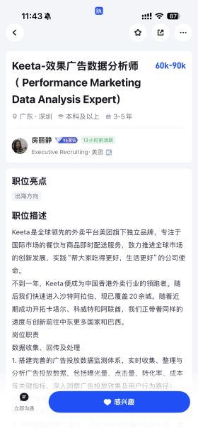 Keeta是美团推出的海外业务品牌,目前已覆盖香港、巴西、沙特、卡塔尔、科威特、阿联酋等多个国家与地区。与此同时,美团Keeta正加大人才招聘力度,在职场平台脉脉发布大量高薪岗位,包括月薪最高9万元的数据分析师、阿联酋活动运营负责人等职位,以及年薪120万元的高级算法专家职位。负责相关招聘的HR也保持分钟级活跃,持续释放岗位。