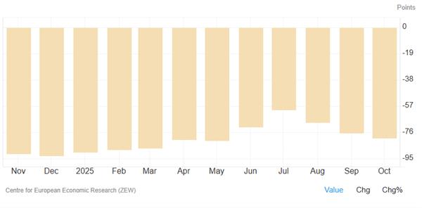 法国的财政担忧:衡量内部压力的一个关键指标是法国10年期政府债券(OATs)与德国国债(Bunds)之间的利差。该利差近期已扩大至约80个基点,高于夏季的65个基点 。利差的扩大反映了市场对法国财政状况的担忧,即所谓的“政 治风险溢价”正在上升。法国的预算赤字占GDP的5.8%,几乎是欧盟3%上限的两倍 。尽管近期的政 治斡旋可能暂时缓解了市场的恐慌,但潜在的财政脆弱性仍然是欧元的一个软肋。