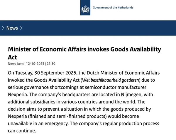 完事跟这个前后脚,第二天荷兰人也发了个公告,说根据 《货物可用性法》,“荷兰及欧洲本土关键技术知识与能力的连续性和安全性面临威胁”,所以要gank安世。