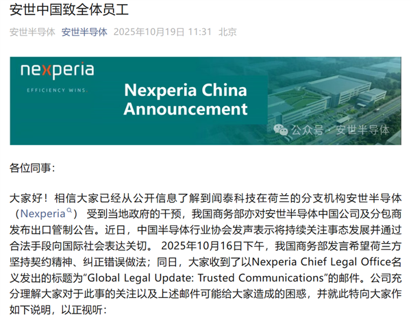 更戏剧性的一幕,发生在安世公司内部。荷兰总部那边刚夺了权,安世中国这边,直接发了封公开信正义切割,总部发来的任何消息大家都当放p,工资福利由国内公司发。