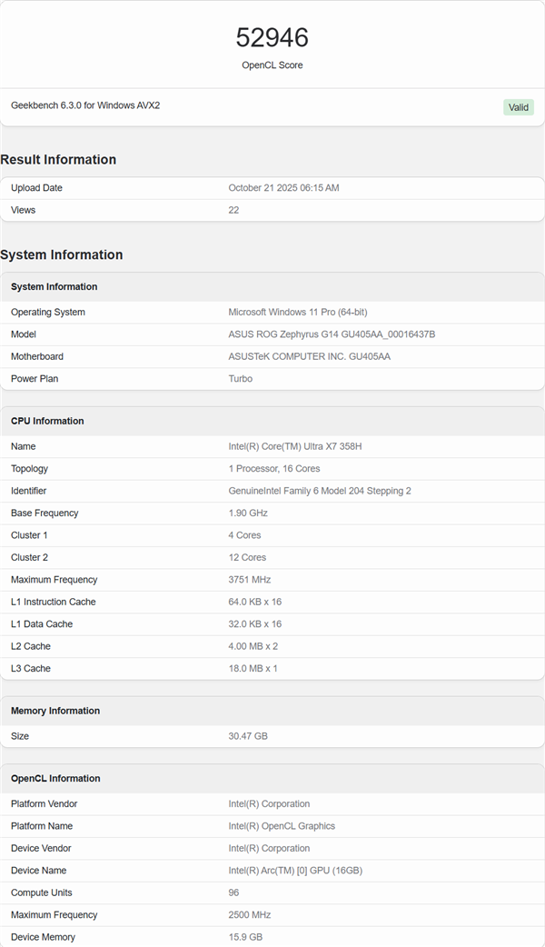 信息显示,这款酷睿Ultra X7 358H搭载于华硕笔记本电脑中,拥有16个CPU核心(4个性能核+ 8个能效核+ 4个低功耗能效核),以及12个Xe3 GPU核心。