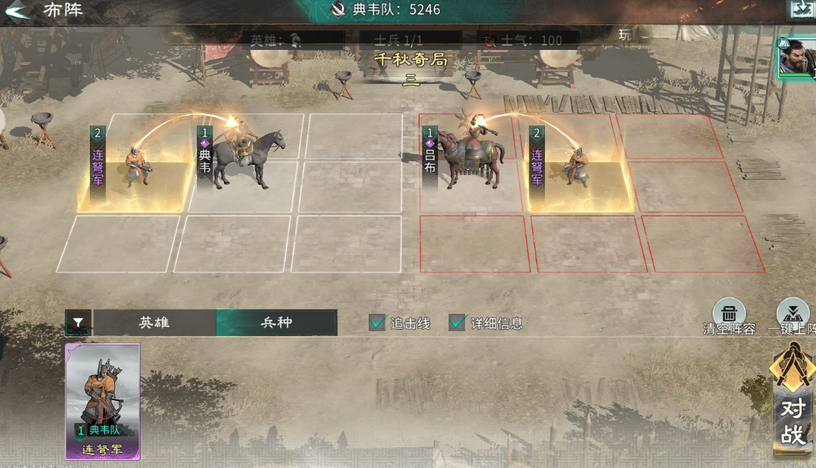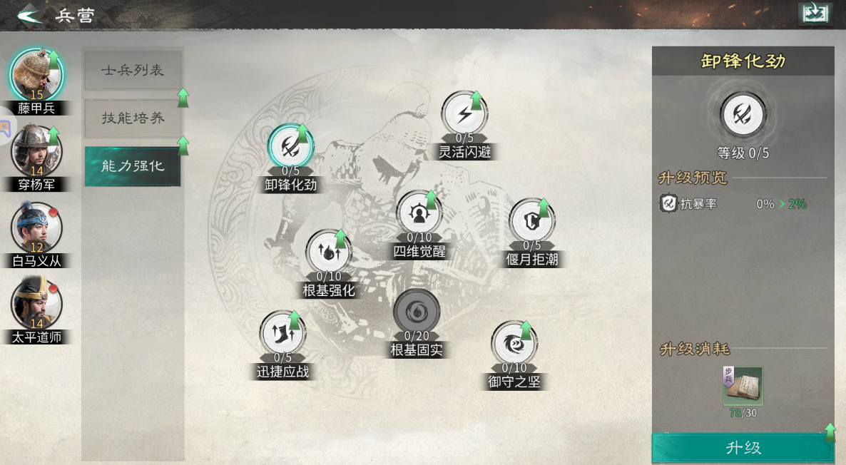 3、带有特技的兵种战力更强;多余的兵种可分解获得训练心得,用以培养和强化兵种属性和技能。