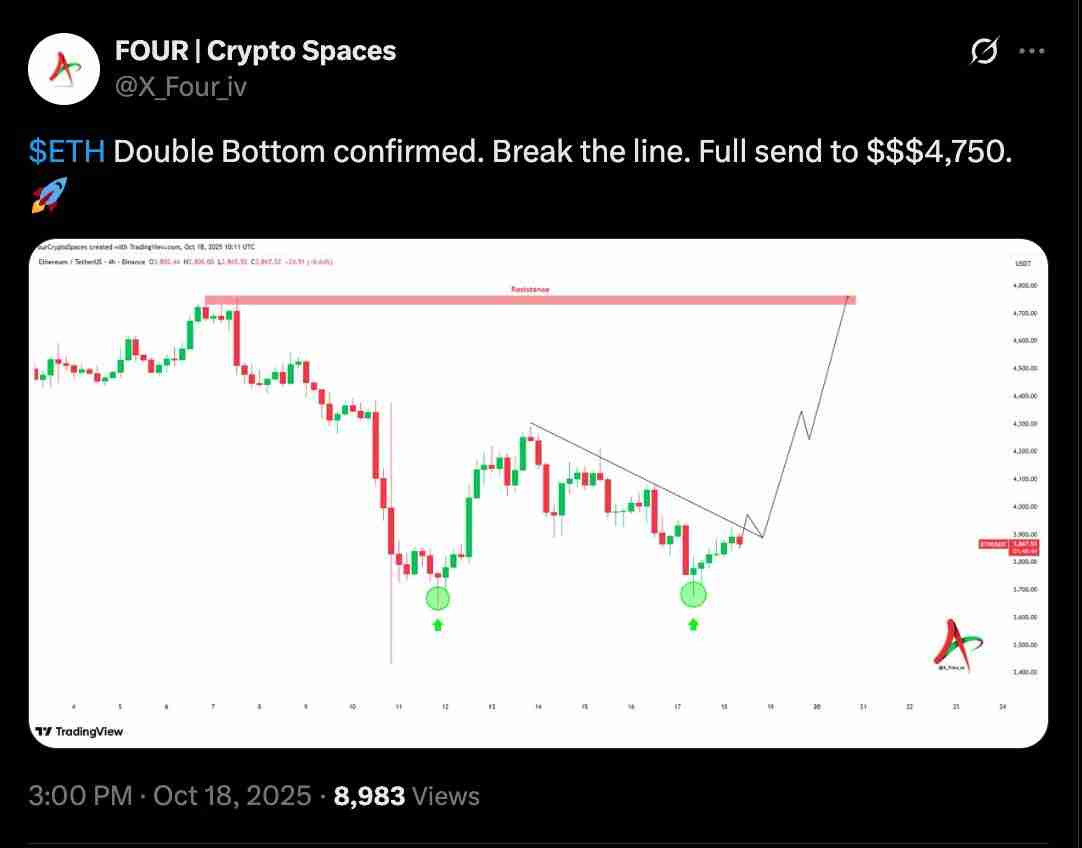 这一预期也与分析师FOUR提出的技术结构相吻合,其指出ETH正在完成双底形态,颈线阻力位于4750美元,一旦突破将确认中期上涨格局。
