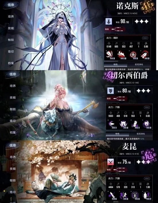 大部分练度不是很重要,比较重要的角色是伯爵和nox,其他都是破核,回血,debuff工具人