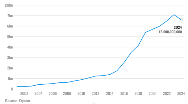 戴森英国官方于近期发布2024年业绩报告,全年戴森营收66亿英镑,较2023年营收71亿英镑同比下滑7.04%;2024年,公司税前利润5.61亿英镑,较上一年同比减少约49%,近乎腰斩。