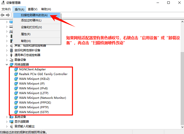 3、如果有,右键选择“启用设备”或“卸载设备”,再点击上方的“操作 → 扫描检测硬件改动”。4、如果仍有问题,再回到“驱动人生”里重新安装驱动即可。